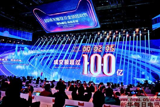 11月11日,在上海举行的2018天猫“双11”晚会上,大屏显示仅用了2分05秒阿里巴巴平台上的成交额就冲破100亿元。  新华社记者黄宗治摄