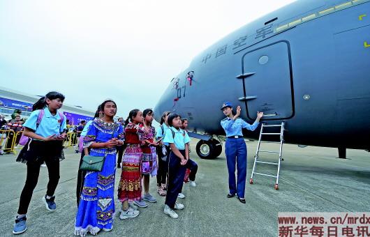蓝天春蕾女童在航展现场参观(11月10日摄)。空军近年来积极参与打赢脱贫攻坚战工作,连续24年实施“蓝天春蕾计划”,依托“六项工程”先后实施269个扶贫项目,参与帮扶117个贫困村、5711个贫困户,把党和军队的温暖送到了群众心坎上。