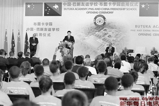 两国领导人分别致辞。习近平指出,近年来,中国同巴新人文、教育交往越来越密切,地方合作蓬勃开展。布图卡学园就是中国广东省和深圳市同巴新首都行政区友好合作的结晶。人才是第一资源。授人以鱼不如授人以渔。中国援建布图卡学园就是为了帮助巴新培养人才。相信人才辈出一定可以为巴新实现可持续、后来居上发展提供强有力支撑。我们愿同巴新方深化植根于两国人民中的深厚友情,为两国关系持续向前发展打下更加坚实的基础。