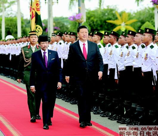 习近平抵达王宫时,哈桑纳尔在停车处热情迎接。两国元首登上检阅台。仪仗队行礼,军乐队奏中文两国国歌。现场鸣放21响礼炮。在哈桑纳尔陪同下,习近平检阅仪仗队。检阅毕,两国元首前往王宫内廷。习近平同文莱王室成员、主要官员及各国驻文莱使节握手。哈桑纳尔同中方陪同人员握手。