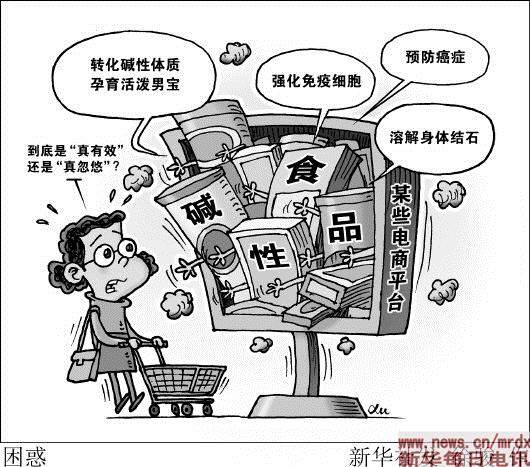 不少碱性食品和保健品采用相似的宣传手法:首先将“精神不振”“减脂无果”“痛风”“亚健康”等健康问题与“酸性体质”相关联。进而强调其产品是碱性或强碱性食品,能够帮助消费者快速恢复“酸碱平衡”,具有癌症预防、结石预防、肝脏强化等数十种功效。