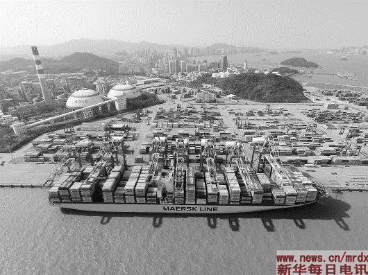 福建自贸区厦门片区海沧嵩屿码头内,一艘国际集装箱货轮在卸货。新华社记者姜克红摄