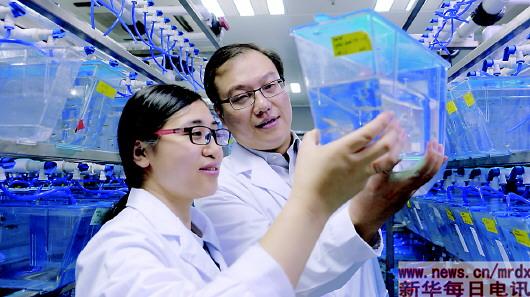 ▲潘巍峻研究员正在斑马鱼模式动物平台指导其团队成员。中科院供图 |