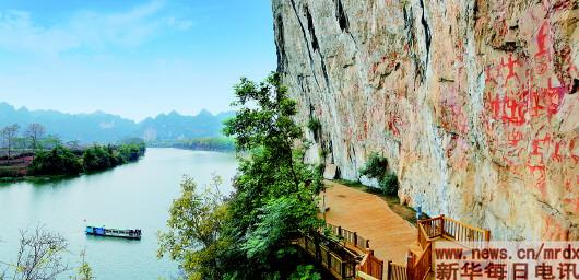 由于“世界文化遗产”保护的升级,游客不能登岸近距离看画,只能在游船靠近崖壁时抬头仰望。一片片赤红的画面喧闹而热烈,眼前仿佛出现了铜鼓声声、人欢马啸的场景。经历了千百年岁月风雨的冲刷,“小红人”仍然栩栩如生,让人浮想联翩,神游画外。