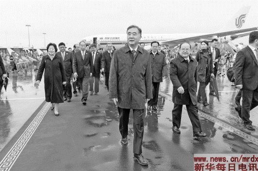 上午11时30分许,中央代表团乘坐的包机徐徐降落在停机坪上,等候在这里的500多人的欢迎队伍爆发出热烈掌声和欢呼声。汪洋走出飞机舱门,向欢迎群众挥手致意。