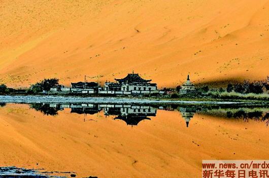 巴丹吉林沙漠中的一道奇景,是位于沙漠深处的巴丹吉林庙。这是一座藏传佛教寺庙,始建于1755年。庙旁是苏敏吉林湖,湖中有庙影,庙后沙连天。苏敏吉林湖背靠一座高而陡峭的沙山,沙子在六七十度的斜坡俯冲而下,有倾泻掩埋湖水之势,却在紧贴湖面的边缘奇迹般地立起一堵高墙,像大山一样地坚固牢靠,用巨大的身躯守护着脚下的一池清泉,几百年来寸步不动,令人感叹大自然的神奇造化。