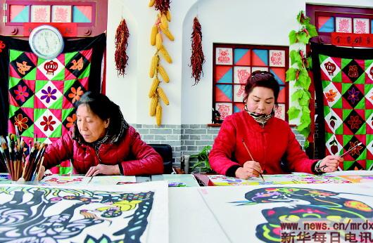 ▲陕西宜君县的两名农民画画家正在作画(12月12日摄)。新华社记者都红刚摄