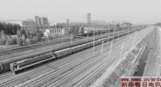 ▲一列中欧班列(郑州)列车从河南郑州国际陆港公司驶出(2017年5月6日摄)。新华社记者冯大鹏摄