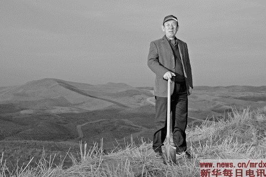 王有德在毛乌素沙漠边缘(2013年11月19日摄)。新华社记者王鹏摄 |