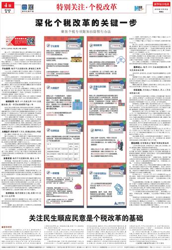 个税改革迈好关键一步更不易。国务院明确了个税6项专项附加扣除——子女教育、继续教育、大病医疗、住房贷款利息或住房租金、赡养老人等支出具体扣除的范围和标准,都关乎百姓切身利益。办法的出台充分听取民意、集纳民意、体现民意。制订办法前,财税部门首先通过实地调研、与各界人士座谈等方式掌握一手情况,随后向全社会公开征求意见。最终办法吸收大量民意,做出不少调整。例如,将大病医疗个人负担能扣除的最高限额从6万元提高到8万元,并可以由夫妻任何一方抵扣,考虑了病患家庭负担。
