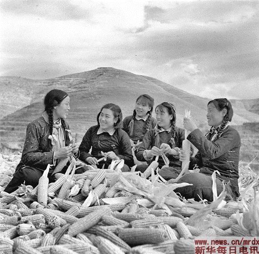 ▲申纪兰(左)和妇女们在一起劳动(资料照片)。 新华社发 |