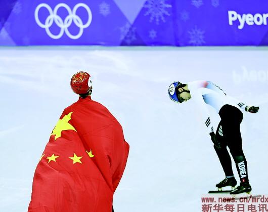 ▲图为2018年2月22日,武大靖(左)在平昌冬奥会短道速滑男子500米决赛夺冠后身披国旗庆祝。新华社记者兰红光摄