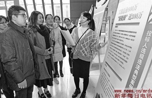 12月24日,讲解员在福清市举办的警示教育展上向党员干部介绍案例。当日,“福州市工程项目招投标工作警示教育展”在福州所辖县(市)区中同步开展,展览选取福州市近年来发生在土地使用出让、产权交易、政府采购等领域招投标工作中的违纪违法以及“不作为、慢作为、乱作为”典型案例教育党员干部,增强拒腐防变能力。