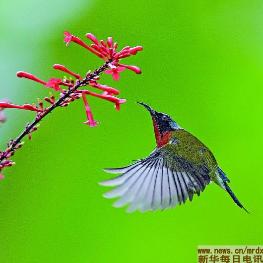 虽是冬日,福建省福州国家森林公园内的红苞花却竞相绽放,吸引了大批叉尾太阳鸟前来采蜜。叉尾太阳鸟又名亚洲蜂鸟,是福州特有的“明星鸟”。新华社记者梅永存摄