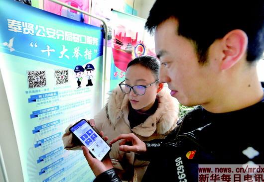 12月29日,上海市公安局奉贤分局金海派出所民警曹俊甲(前)指导居民使用“警民e家”微信小程序。