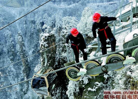 ▲1月1日,湖南张家界武陵源风景区天子山索道工作人员卓名海(左)、杨湘文在索道支架上巡检。当日是新年第一天,众多劳动者忙碌在工作岗位上。新华社发(吴勇兵摄)