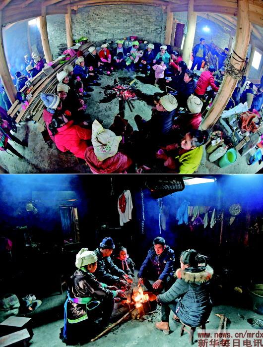 | 上图为在新木楼里,亲朋好友围坐在火塘边烤火;下图为吴正怀一家在老房子的火塘边烤火(拼版照片,1月17日摄)。 |