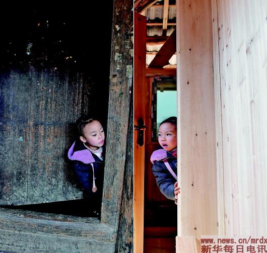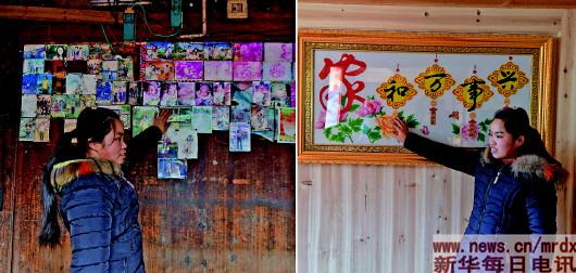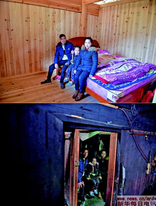 吴正怀的儿子、儿媳和孙女在新老房子的卧室里合影(上为新木楼)(拼版照片,1月18日摄)。 |