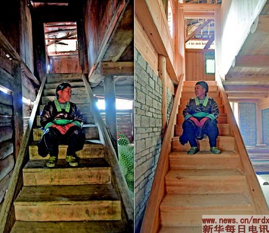 | 吴正怀的儿媳潘彩花在新老房子的客厅里(右为新木楼)(拼版照片,1月18日摄)。 |