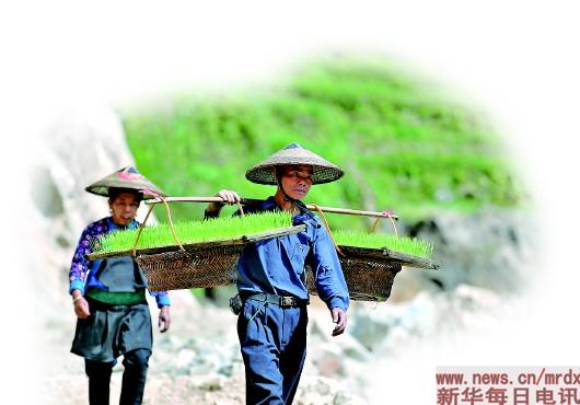 | 吴正怀(右)和妻子挑着秧苗去插秧(2018年4月17日摄)。 |
