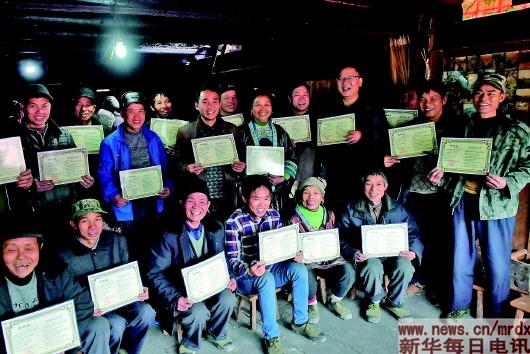 | 乌英苗寨水果种植专业合作社第一次理事会会议现场,吴正怀(右一)和社员们刚刚领到股权证(1月11日摄)。 |