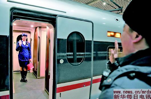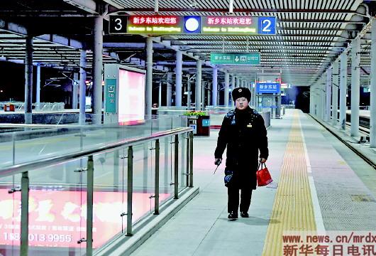 1月22日晚6时54分,G402次列车停靠在中国铁路郑州局集团有限公司新乡东站,车站工作人员李翔在引导旅客上下车完毕后将事先准备好的餐包递给了车内的妻子邹小娟。