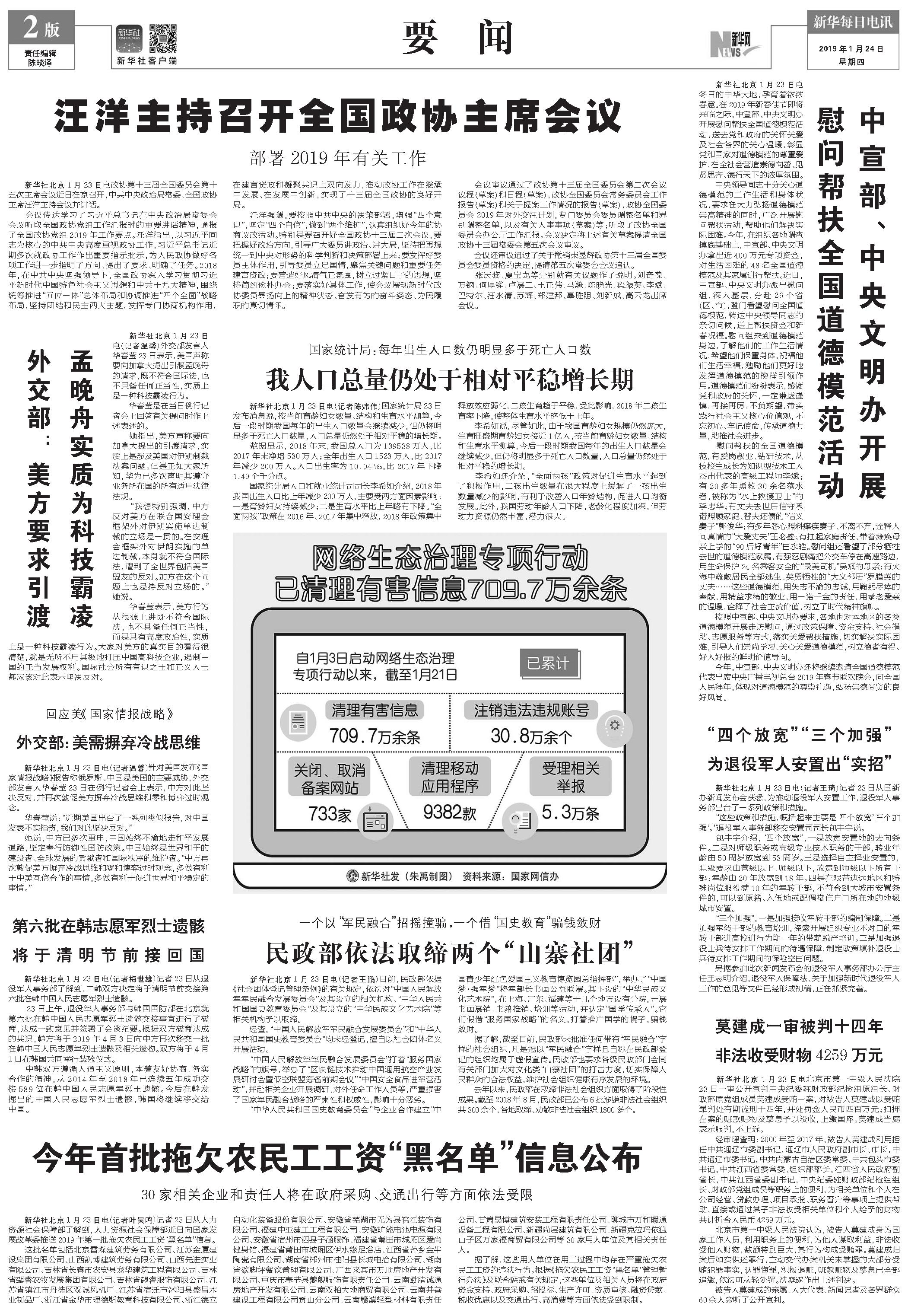 汪洋主持召开全国政协主席会议 (2019年01月24日) |