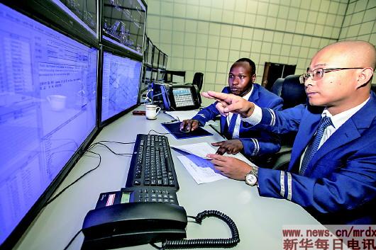 ▲在肯尼亚内罗毕,王滔(右)和肯方员工在蒙内铁路调度指挥中心内熟悉各项指令。