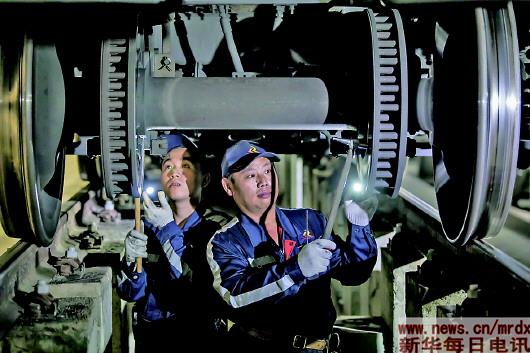 ▲在肯尼亚内罗毕,负责维护保养的“火车医生”团队成员谢永军(左)和严学兵检查车轮。