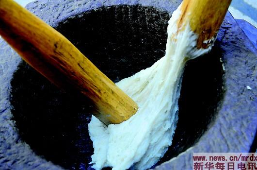 春节期间,地处湖北省山区的农民在手工制作糍粑。