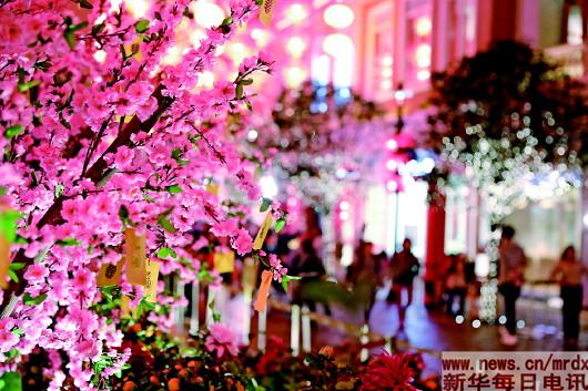 游客在香港街头游览(2月17日摄)。除夕过,元宵近,香港街头多灯河。游客夜乐游,沉浸吉祥红。