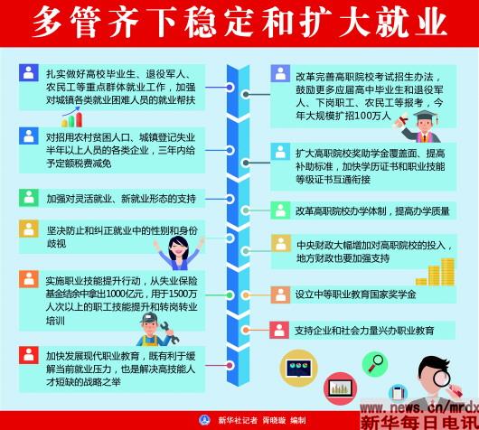 政府工作报告提出,实施职业技能提升行动,从失业保险基金结余中拿出1000亿元,用于1500万人次以上的职工技能提升和转岗转业培训。加快发展现代职业教育,今年高职大规模扩招100万人。