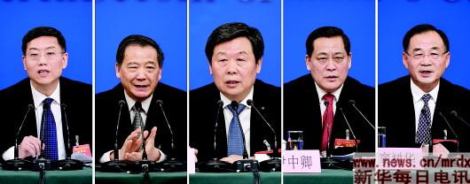 ▲图为徐显明(中)、尹中卿(右二)、吴恒(左二)、窦树华(右一)和朱明春(左一)就“人大监督工作”相关问题回答中外记者提问(拼版照片)。新华社记者王鹏摄
