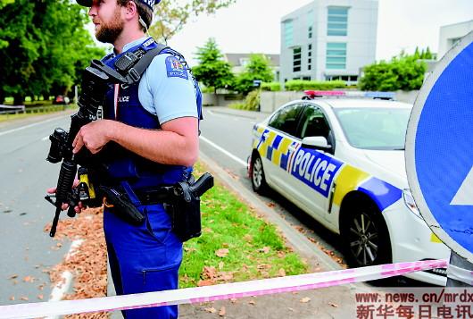 3月21日,在新西兰克赖斯特彻奇,警察在15日恐袭案发生现场附近警戒。恐袭案发生后第六天,新警方仍封锁着事发现场。