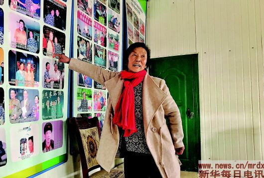 ▲田桂荣指着墙上的宣传图片介绍自己的事迹(2018年12月26日摄)。 |