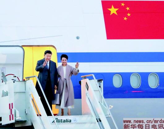 当习近平乘坐的专机进入意大利领空时,2架意大利空军战机升空护航。当地时间晚6时30分许,专机抵达罗马菲乌米奇诺机场。习近平和夫人彭丽媛步出舱门,礼兵敬礼致意,意大利农业旅游部部长等高级官员在舷梯旁热情迎接。习近平和彭丽媛沿红地毯前行。礼兵肃立在红地毯两侧,行注目礼。