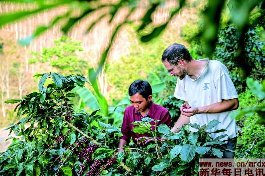 ▲云南省普洱市镇沅彝族哈尼族拉祜族自治县秀山村咖农王剑(左)和来自美国的驻村咖啡指导杰雷米·赫什伯格一起采摘咖啡鲜果(3月18日摄)。新华社记者何春好摄 |