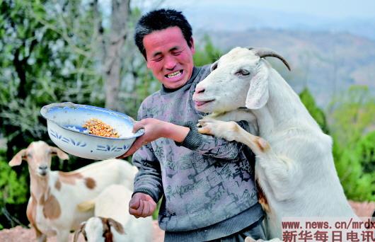▲在河南省卢氏县沙河乡果角村,任当锋在喂羊(3月27日摄)。
