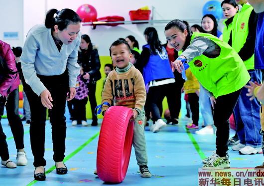 ▲3月29日,江西省宜春市袁州区启慧康复教育发展中心,志愿者与自闭症儿童及家长在一起做游戏。