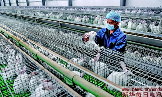 4月2日,在位于陕西省洛南县保安镇眉底村的陕西欧标新星兔业扶贫有限公司繁育基地,村民为仔兔防疫。