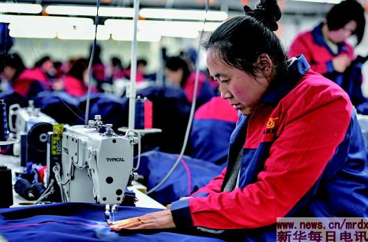 4月2日,村民在洛南县古城街社区工厂加工服装。