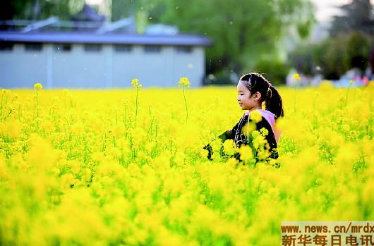 4月7日,小朋友在西石门村的油菜花田里游玩。近日,河北武安市西石门村的油菜花竞相开放,一片金黄,吸引游人前来观赏。 新华社记者王晓摄