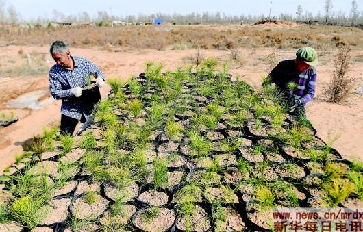 ▲陕西省榆林市靖边县东坑镇毛团村的村民在栽种樟子松树苗(4月4日摄)。新华社记者刘潇摄 |