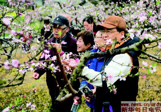 | ▲镇上的桃花节开幕,参加抱团养老的老人们前去观赏桃花(3月29日摄)。 |