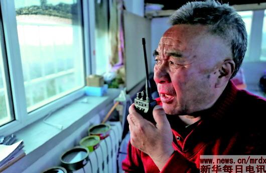 ▲4月8日,刘文鑫在虎山瞭望岗哨用对讲机与其他护林员交流。