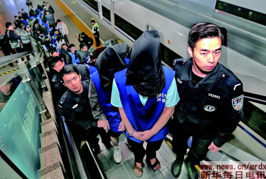 犯罪嫌疑人被押解离开上海虹桥火车站(4月10日摄)。今年3月,上海市公安局闵行分局接市民报案,称遭到网络主播“一萌”诈骗。接报后,警方经过缜密侦查,捣毁了一个长期在网上以“创业开店”为名实施诈骗的犯罪团伙。据介绍,该团伙通过抖音网红向粉丝私发微信号,物色被害人。随后,由业务员按剧本与被害人聊天,塑造“创业女孩”形象,骗取开业红包。近日,专案组从广州将40名犯罪嫌疑人押解回沪,并已全部被刑事拘留,该案涉案金额超过800万元,案件正在进一步审理中。