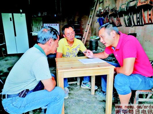 2017年9月,帮扶队员湛果(右),在龙山县楠竹村与村干部一起计算扶贫作物每亩的种植成本。
