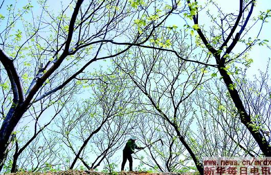 4月20日是二十四节气谷雨,山东省淄博市沂源县悦庄镇崔家庄村的农民在果园里整理土地。