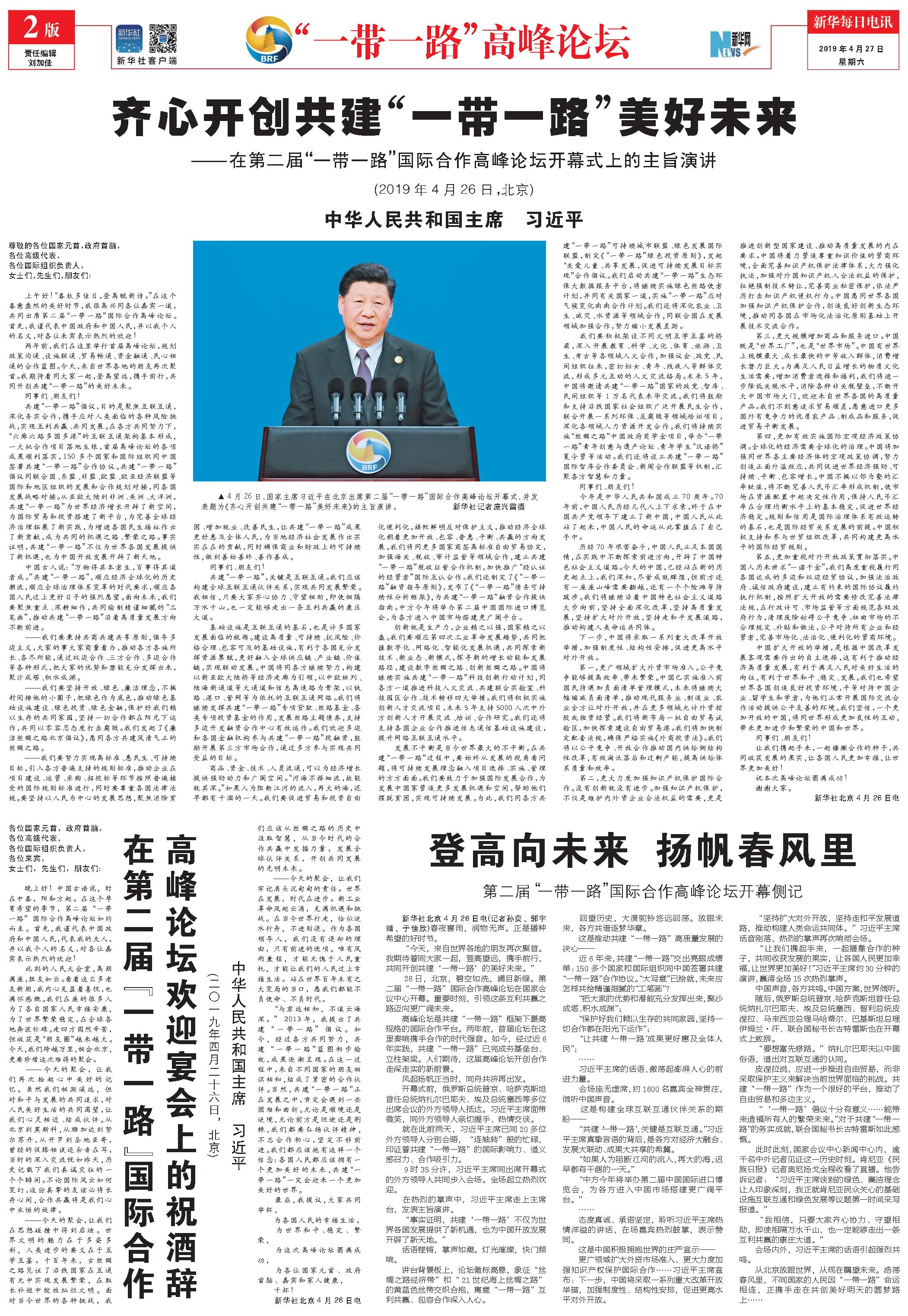 齐心开创共建“一带一路”美好未来——在第二届“一带一路”国际合作高峰论坛开幕式上的主旨演讲(2019年4月26日,北京)中华人民共和国主席 习近平