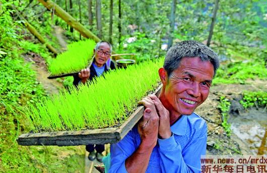 在黔桂乌英苗寨,村民扛着秧苗上山,准备插秧(4月16日摄)。